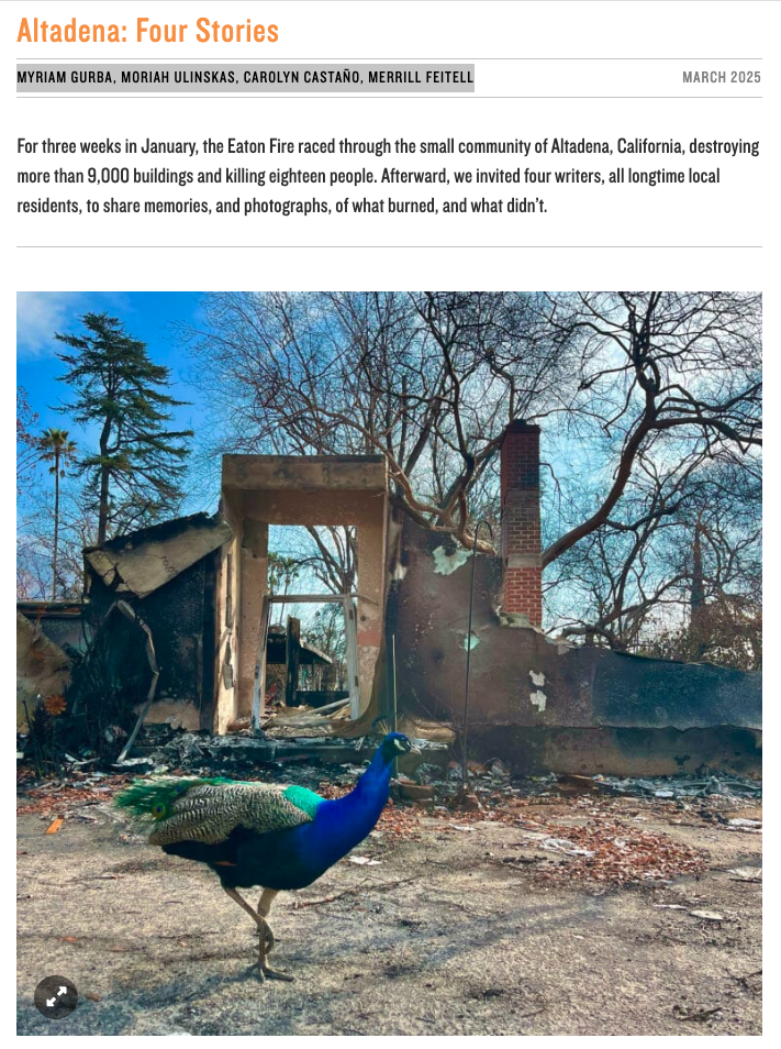 Belatedly barking about my short essay and pics that appeared in the extremely cool journal Places, along with work by Myriam Gurba, Moriah Ulinskas, and Carolyn Castaño. More than 100 days since the Eaton Fire, and though they’ve started clearing properties, much of the mess of it persists on the ground and on my daily to-do list. https://placesjournal.org/article/photographs-from-altadena-after-the-eaton-fire